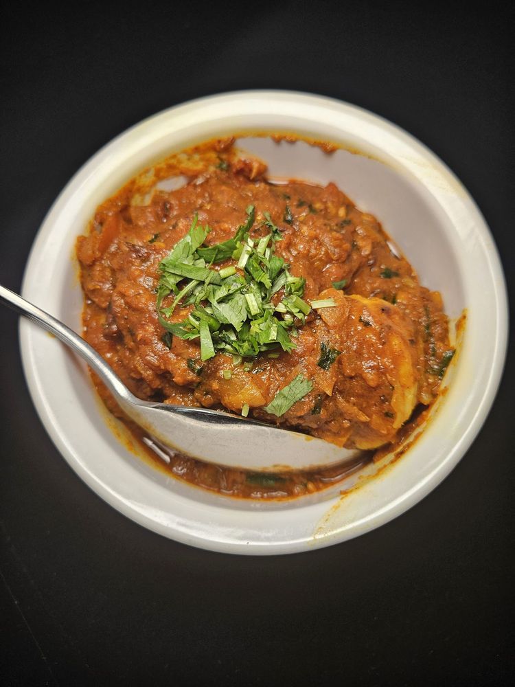 Chunks of chicken cooking in a spicy achar mango pickle sauce.