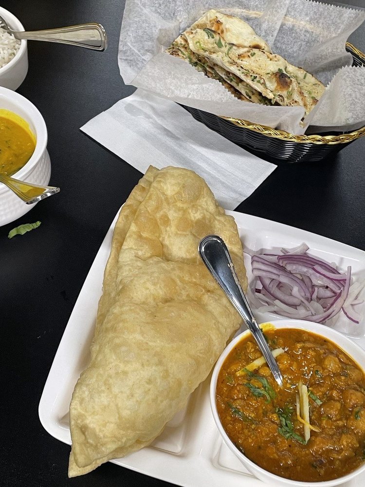 Samosas dumped in chickpea curry mixed in tangy sweet & chili spices.