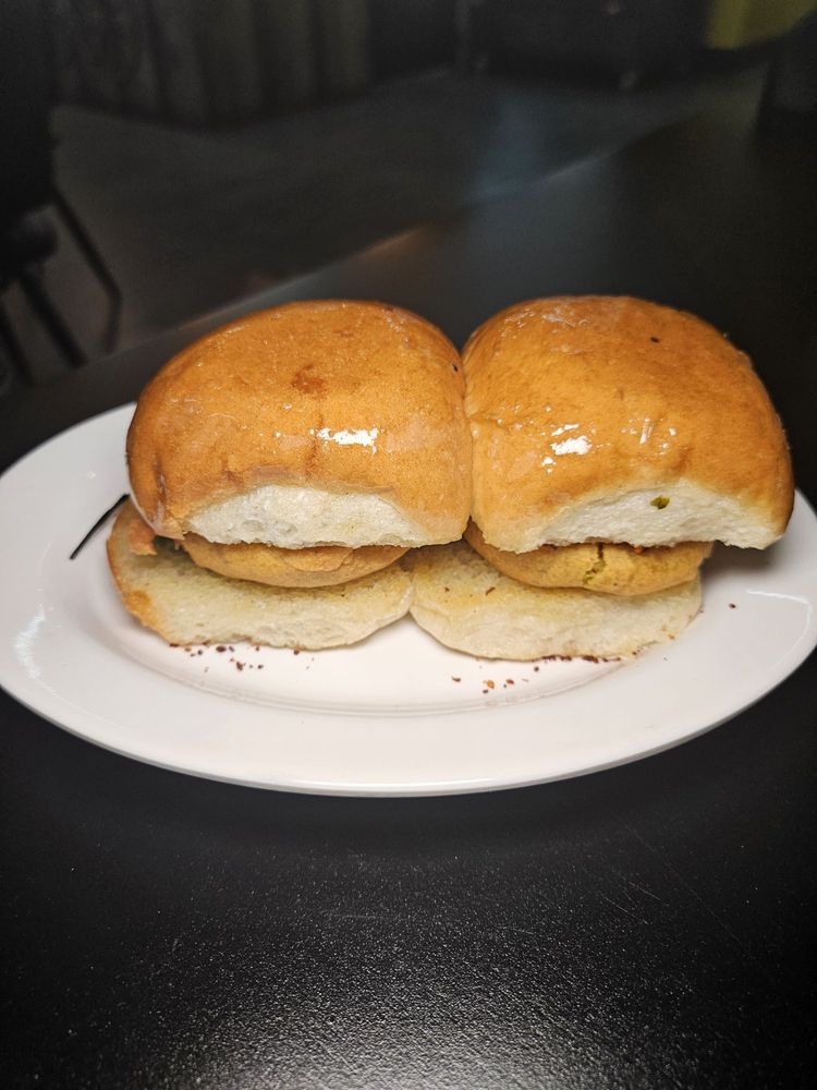 Fried seasoned potato dumpling with raw onions, mint and tamarind chutney in pav bread.